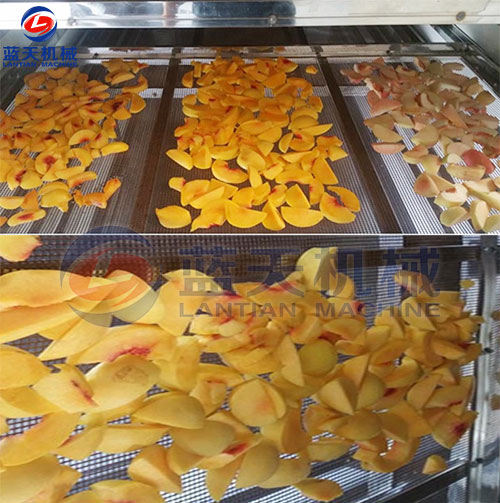 2、均勻切成小塊,放在黃桃烘干機(jī)的托盤上,配置的托盤材料是食品級(jí)別的,不會(huì)對黃桃造成污染。